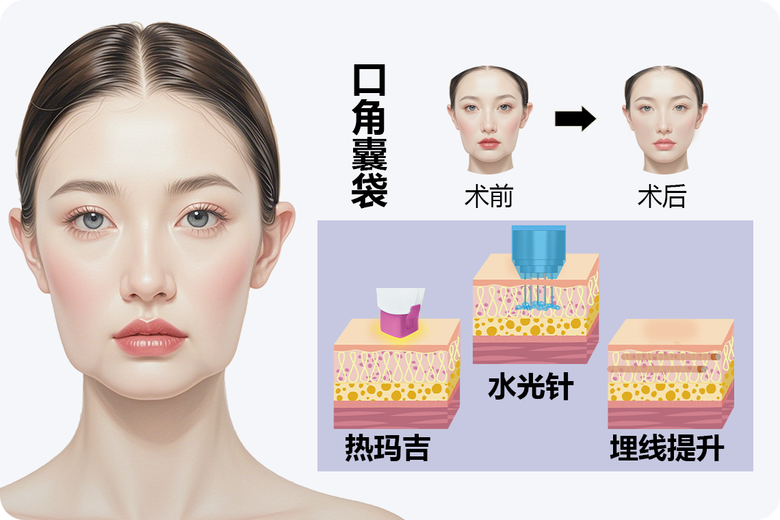 口角囊袋是下面部松弛下垂的一种表现。口角囊袋可能是多种原因引起的,比如年龄增长、表情习惯、不科学减肥、颊脂垫下移、口角炎等,如果是年龄增长引起的,可以通过抗皱产品、按摩、热玛吉等方法改善;如果是表情习惯引起的,需要注意表情管理,或通过水光针、热玛吉改善;如果是不科学减肥导致的,可以通过科学运动、埋线提升的方法进行改善;如果是颊脂垫下移引起的,可以通过热玛吉、水光针、埋线提升的方法改善;如果是口角炎引起的,应配合医生进行药物治疗,恢复后可以通过热玛吉、水光针改善面部状态。