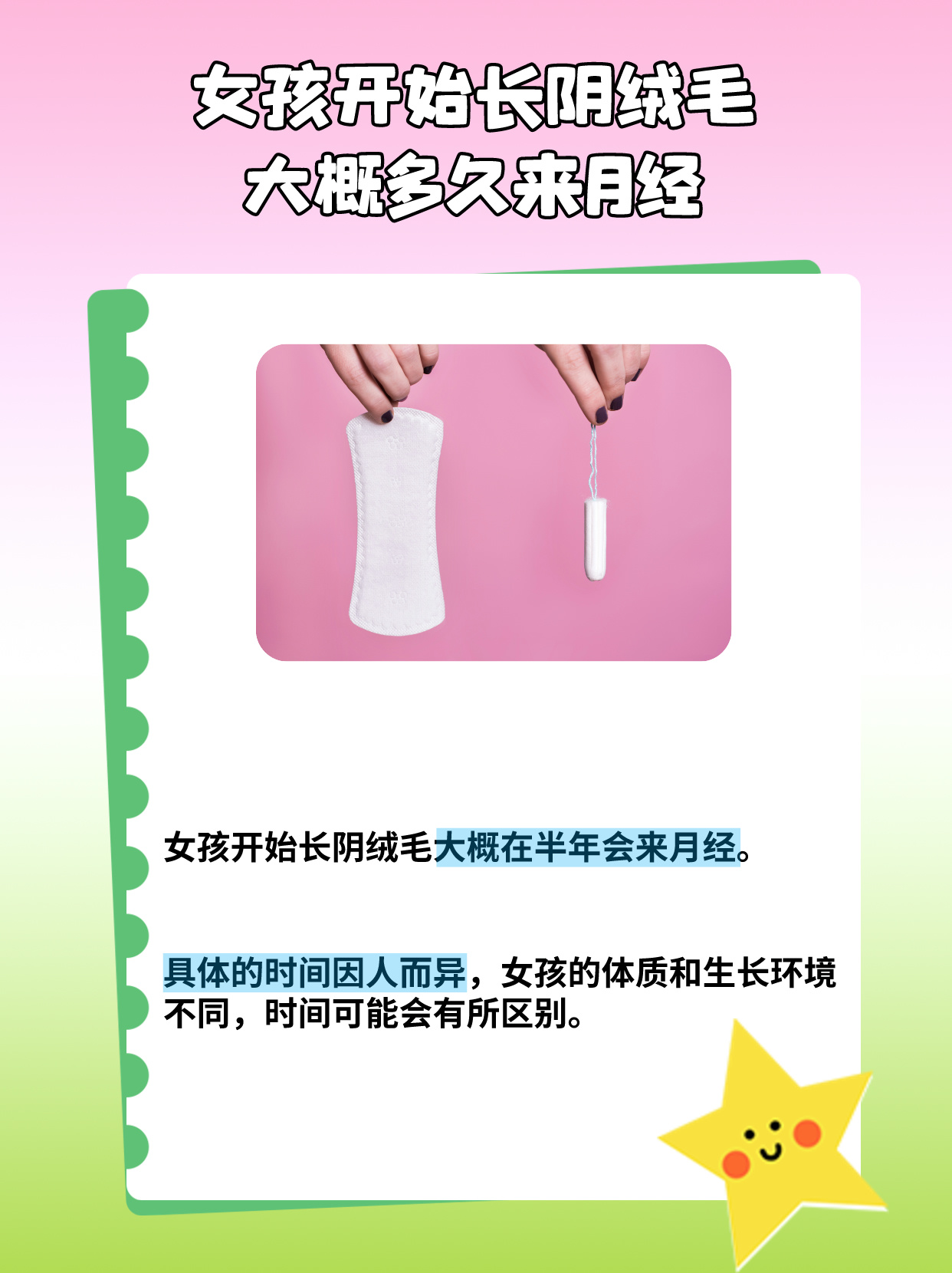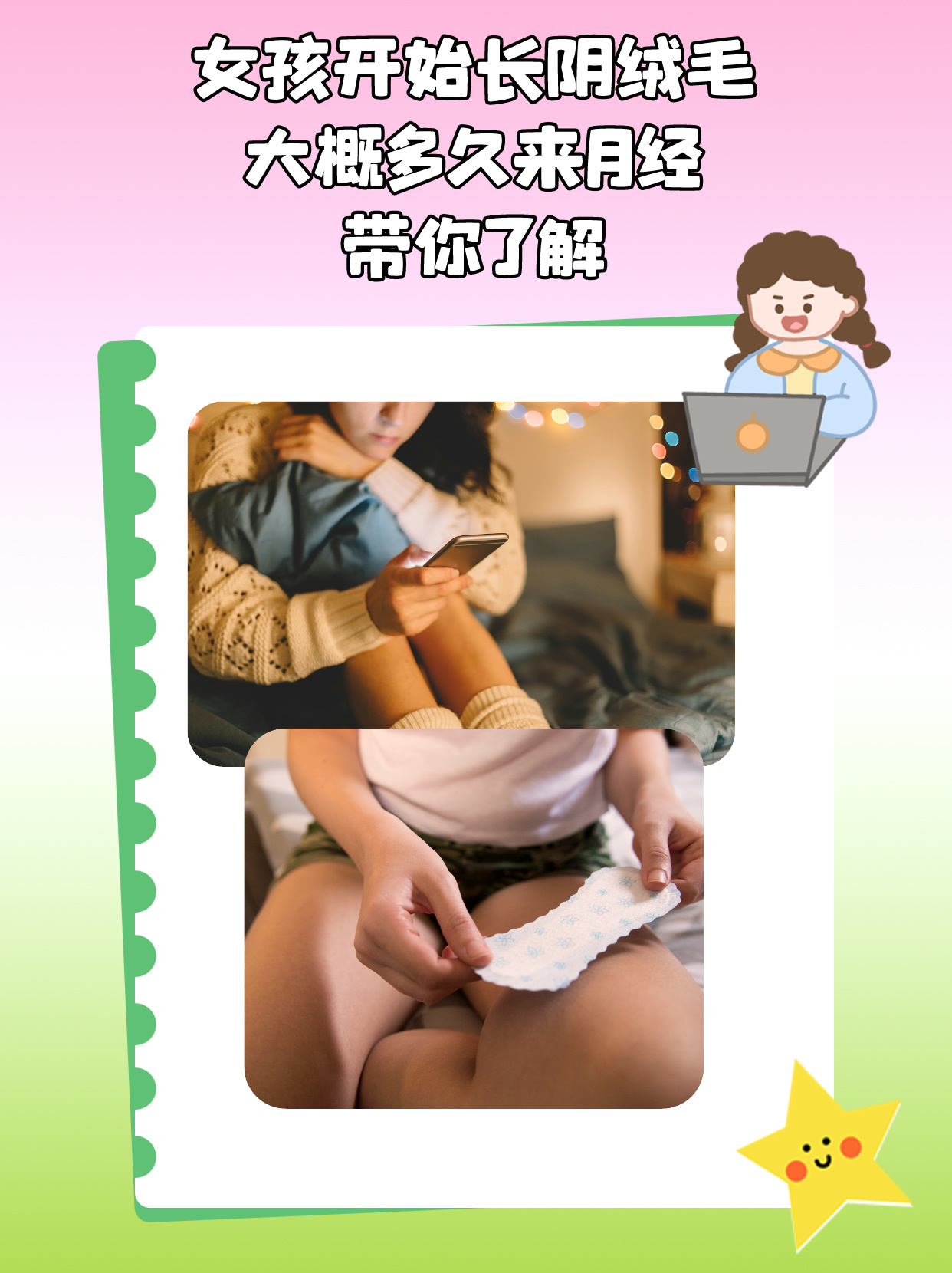 💯2月19日,今天我跟女儿洗澡的时候发现女孩的身体出现了长阴毛的情况,应该是身体已经进入了青春期发育的阶段,可是月经并没有来,咨询了医生,想要知道女孩开始长阴毛大概多长时间来月经?🥇