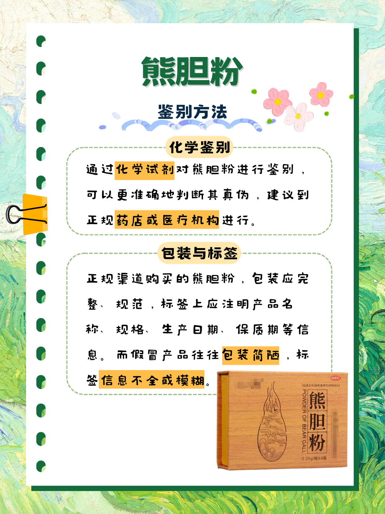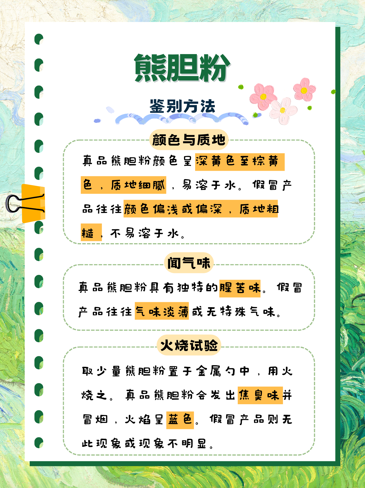 4️⃣化学鉴别:通过化学试剂对熊胆粉进行鉴别,可以更准确地判断其真伪。但这种方法需要专业知识和技能,建议到正规药店或医疗机构进行。