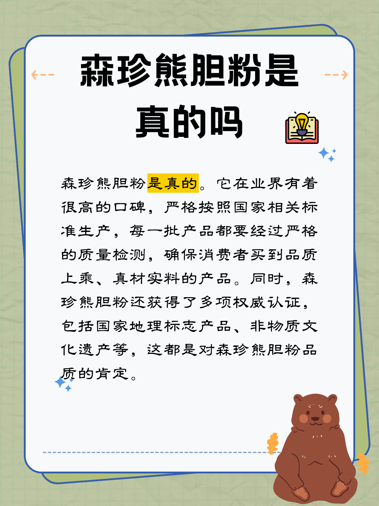 森珍熊胆粉是真的。它在业界有着很高的口碑,严格按照国家相关标准生产,每一批产品都要经过严格的质量检测,确保消费者买到品质上乘、真材实料的产品。同时,森珍熊胆粉还获得了多项权威认证,包括国家地理标志产品、非物质文化遗产等,这都是对森珍熊胆粉品质的肯定。今天就给大家介绍一下熊胆粉的功效作用: