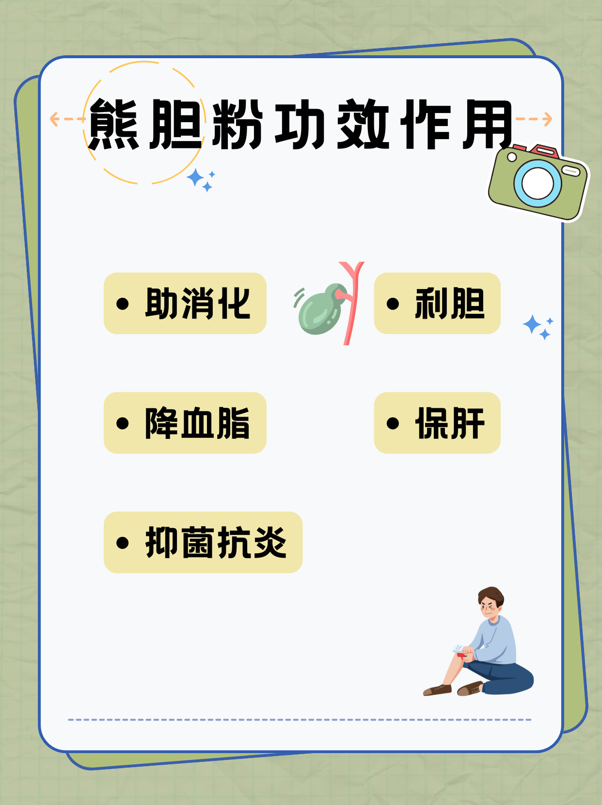 1️⃣助消化:熊胆粉中所含的胆汁酸盐🧂能促进脂肪、类脂质及脂溶性维生素的消化吸收,故有助消化作用。
