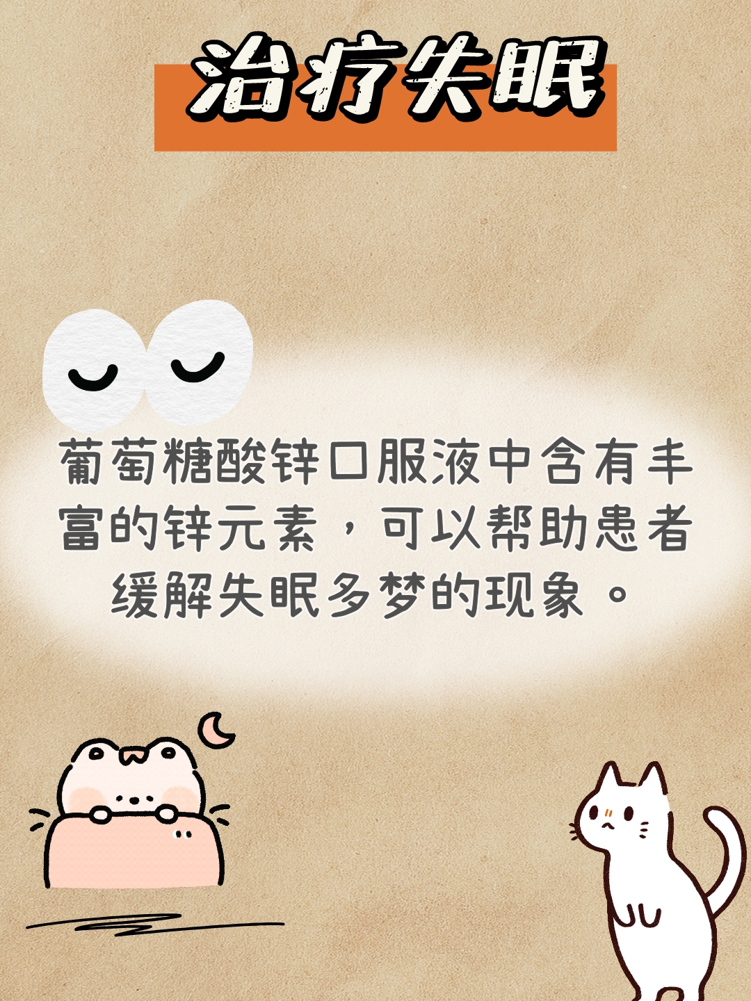 1、治疗失眠:葡萄糖酸锌口服液中含有人体所需的锌元素,可以增强免疫力,从而缓解失眠的现象