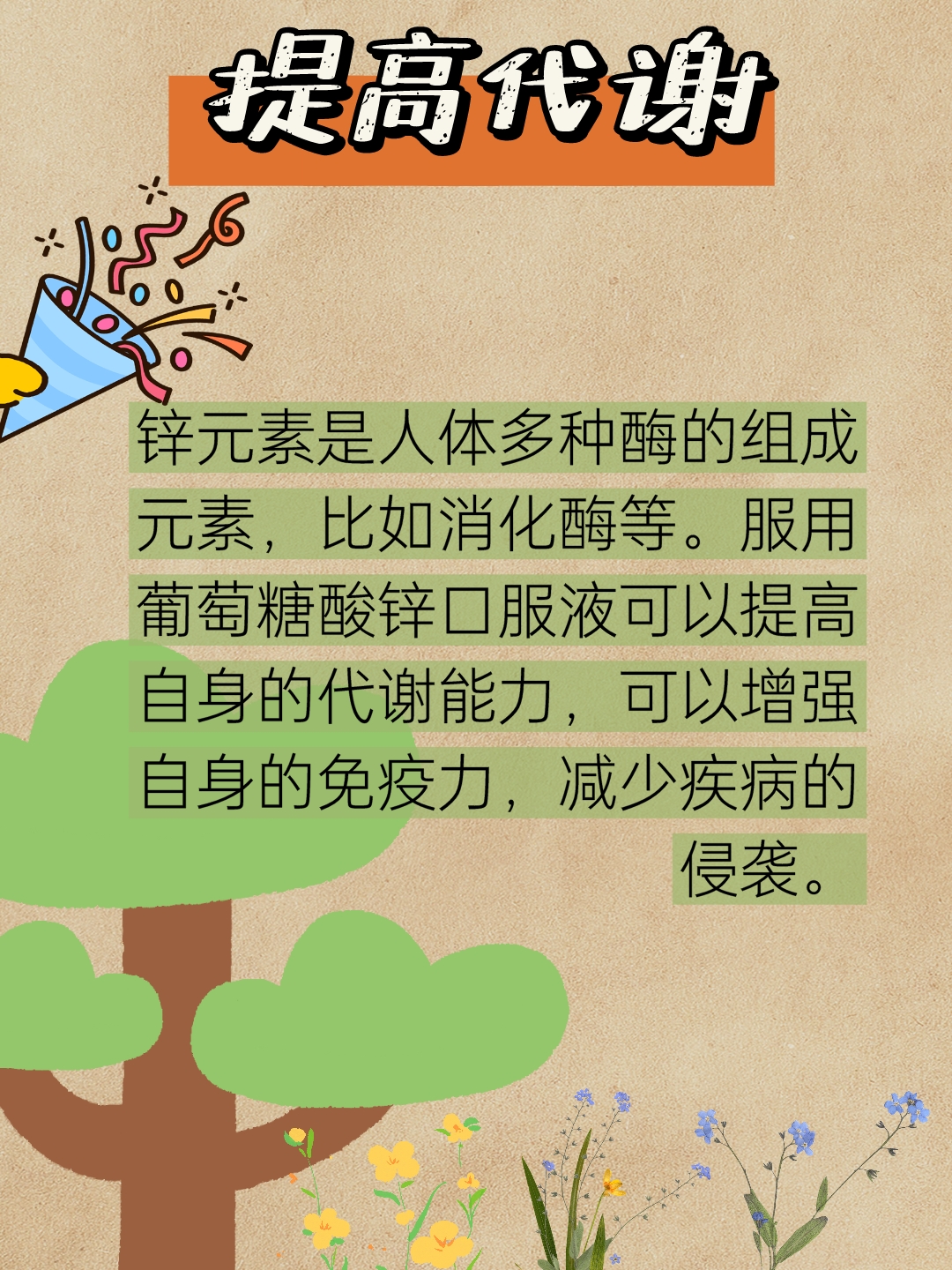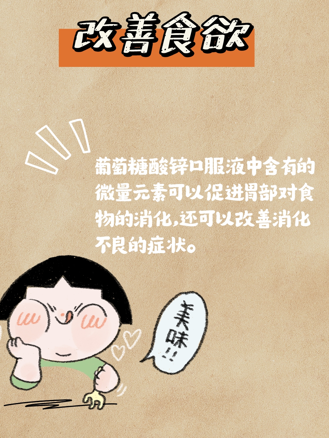 2、改善食欲:葡萄糖酸锌口服液可以促进胃肠道的吸收和消化,从而起到增强食欲的效果。