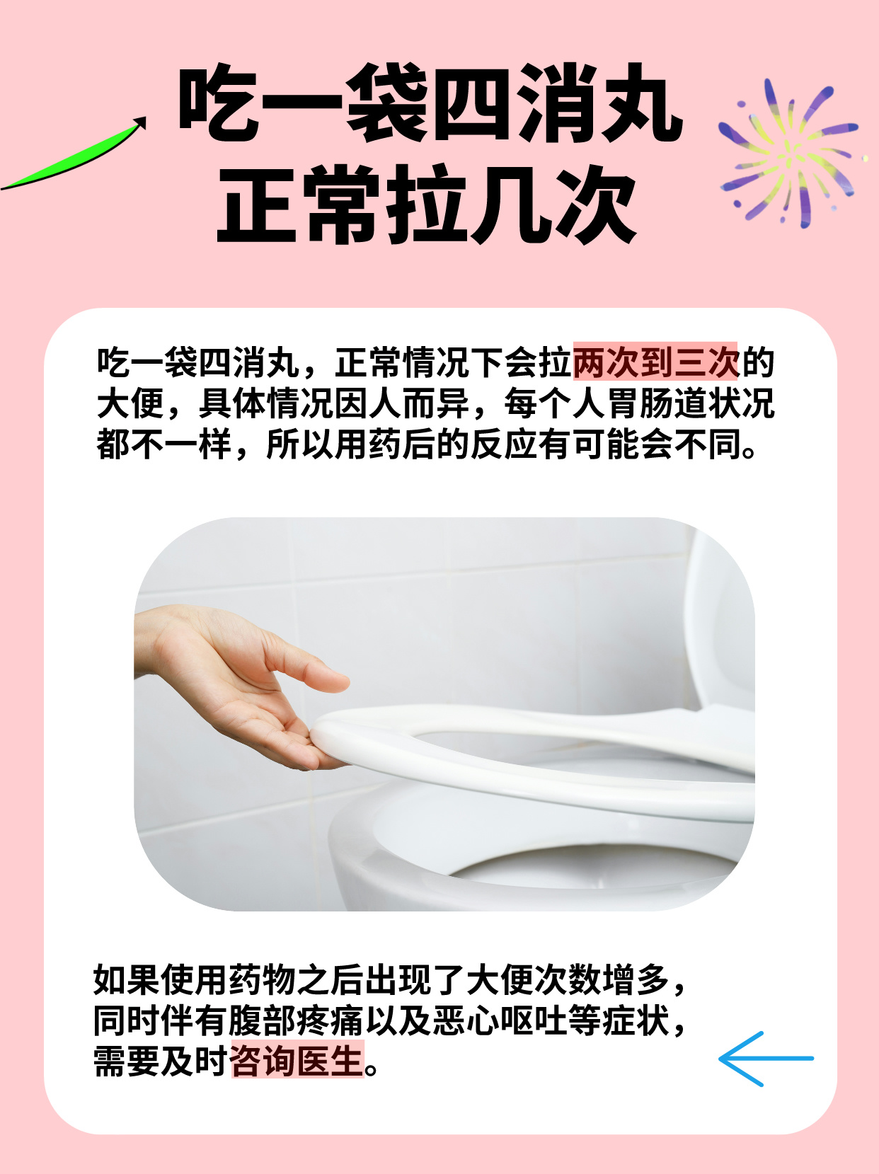 我这样跟这位男士说,四消丸是一种中成药,主要用于治疗胸部闷胀以及腹部胀痛的症状,也可以缓解大便秘结,关于吃了药物之后正常拉几次,要根据个人的情况进行判断,一般来说用药一袋在正常情况下每天可以排两次到三次的大便,有部分肠胃道比较弱的患者排便的次数可能会有所增加,用药之后需要密切关注身体的排便情况,如果大便次数较多,同时伴有腹部疼痛,要及时与医生沟通。💪