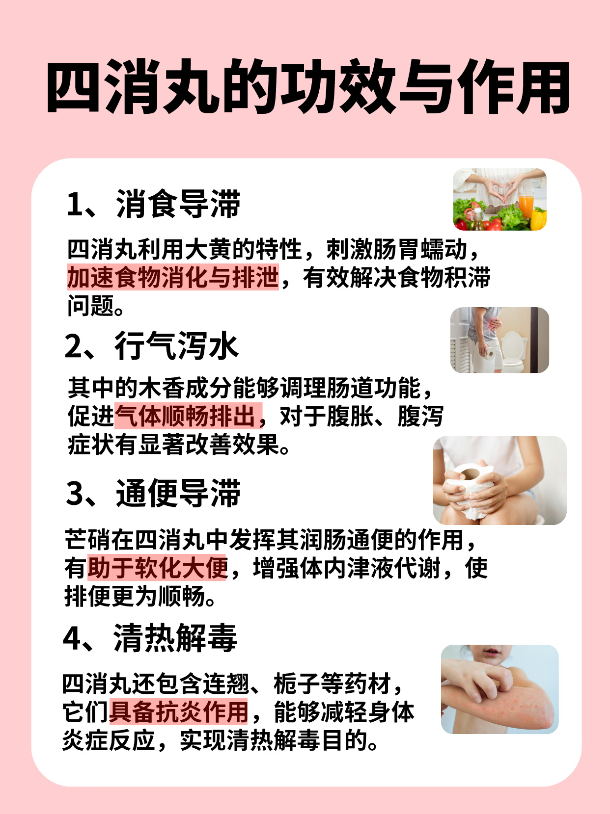 3、通便导滞:四消丸中的芒硝有润燥软坚、泻下攻积之效,能增强体内津液代谢,使大便得以顺畅排出。🔔