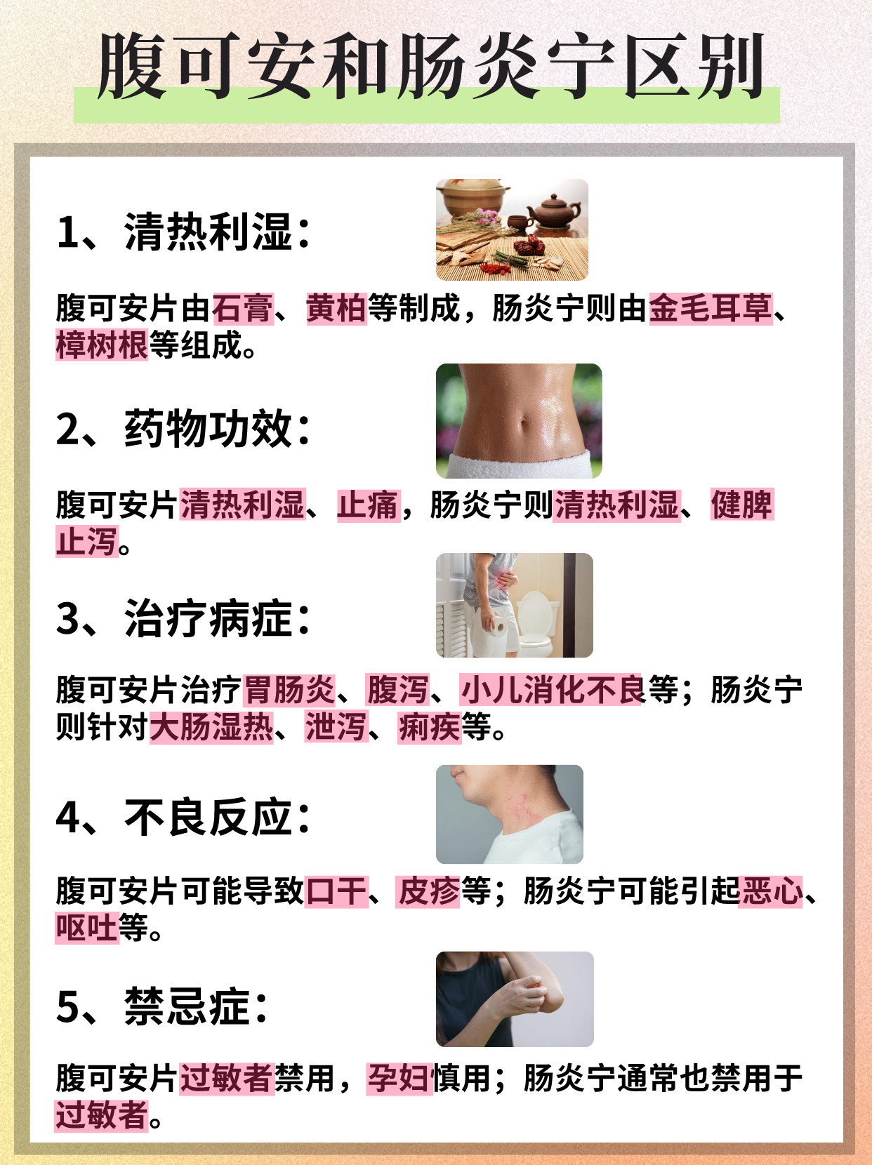 🔥腹可安和肠炎宁在药物成分、药物功效、治疗病症、不良反应以及禁忌证等方面存在差异。在选择药物时,应根据患者的具体病情和医生的建议进行。同时,无论使用哪种药物,都应注意观察不良反应,如有严重症状,应及时就医。🌴