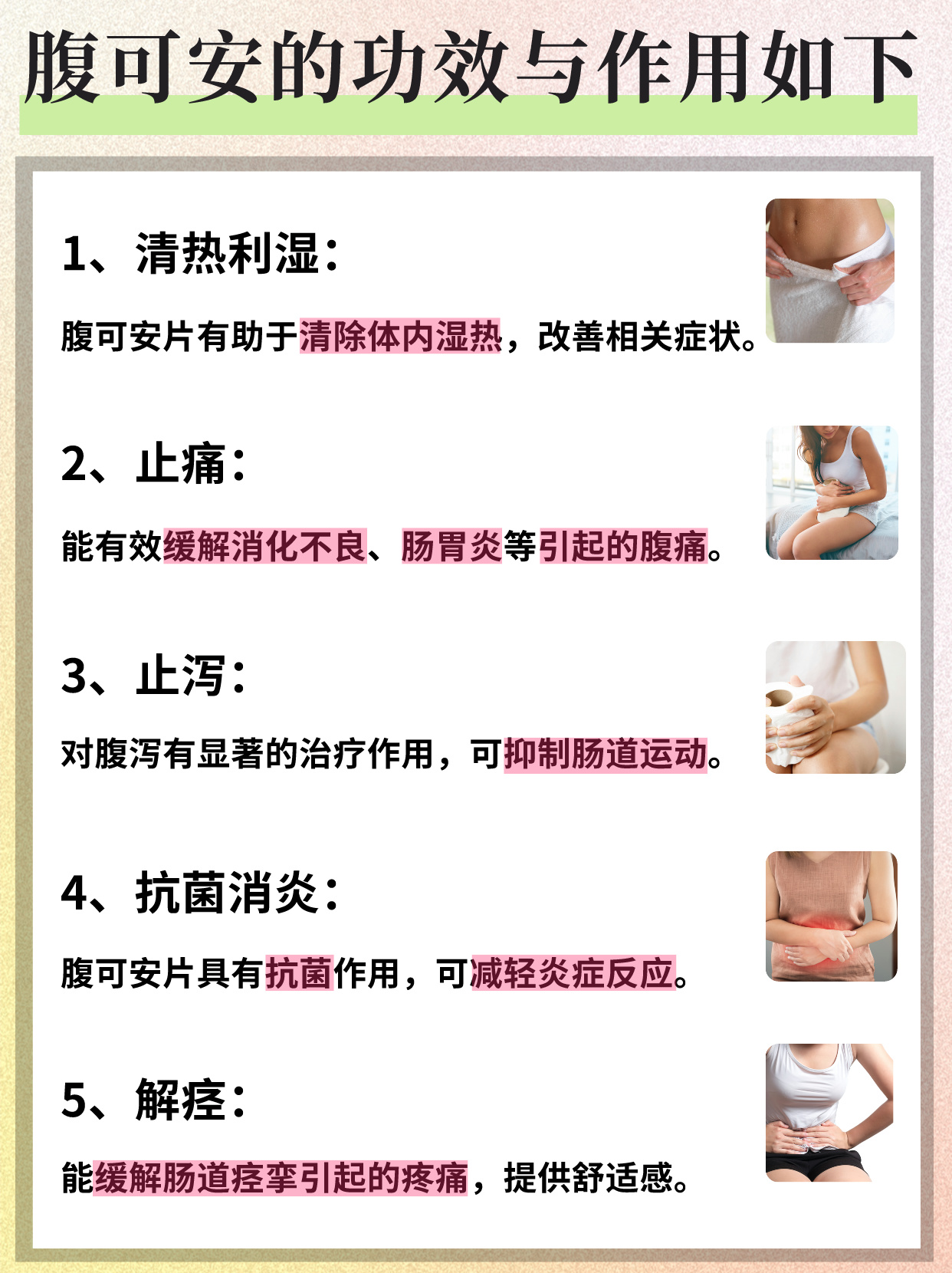 3、止泻:腹可安片对于腹泻有很好的治疗效果,可以抑制肠运动,帮助缓解腹泻症状。🙏