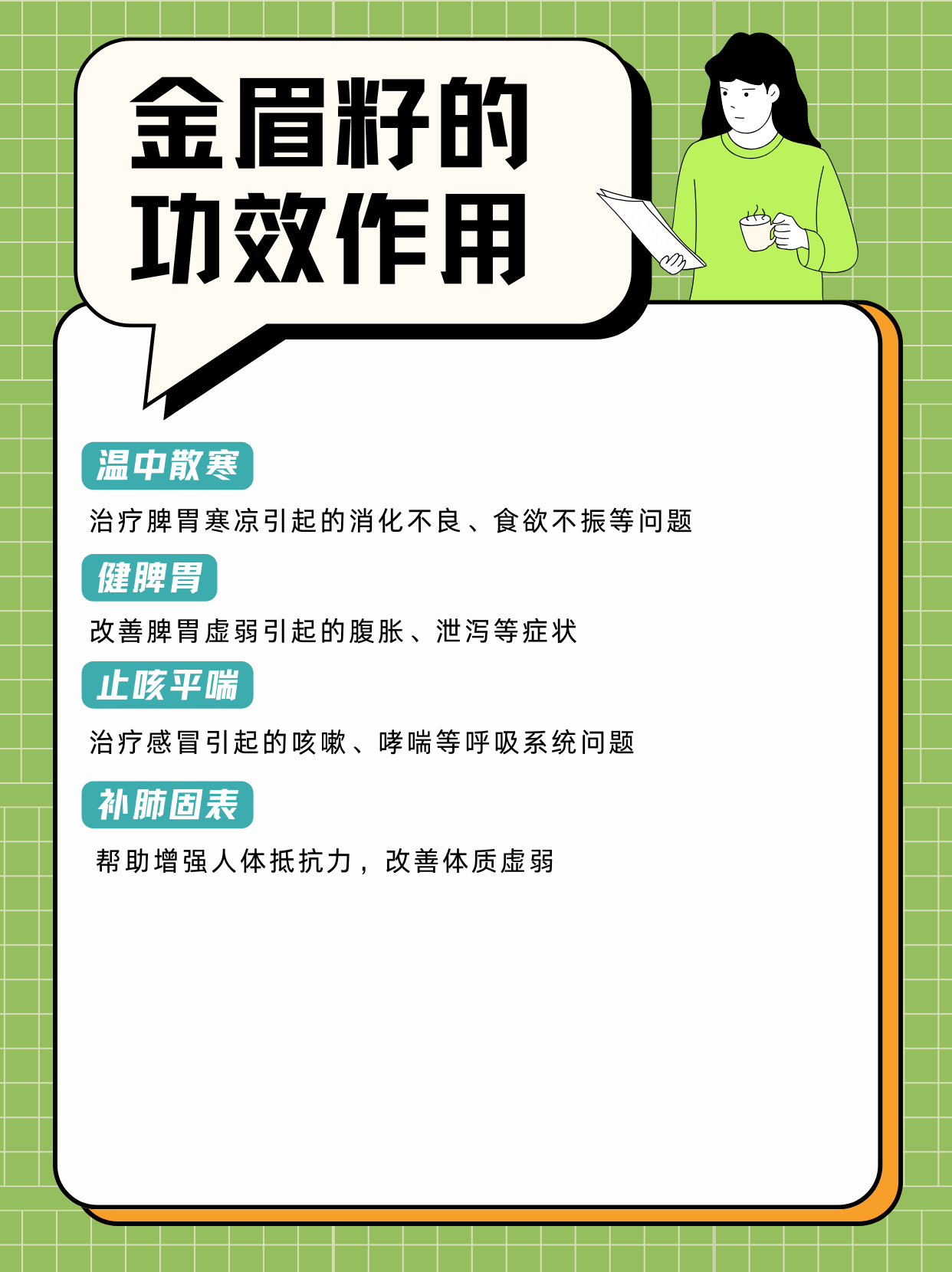 3. 止咳平喘:金眉籽具有止咳平喘的功效,可以用于治疗感冒引起的咳嗽、哮喘等呼吸系统问题。