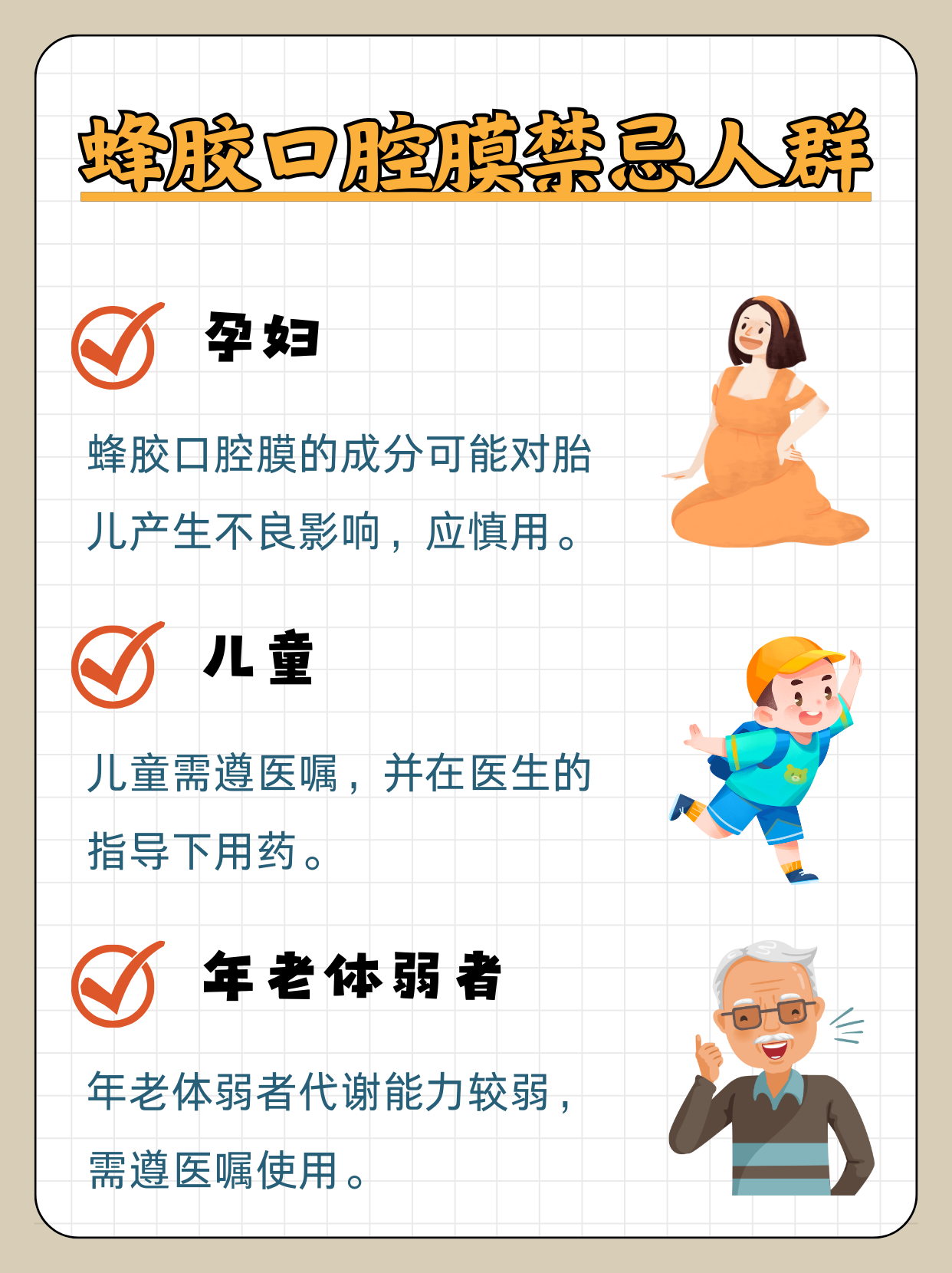 ✅年老体弱的患者:由于年老体弱的患者身体机能下降,药物代谢和排泄能力可能减弱,因此需要在医生的指导下使用蜂胶口腔膜。