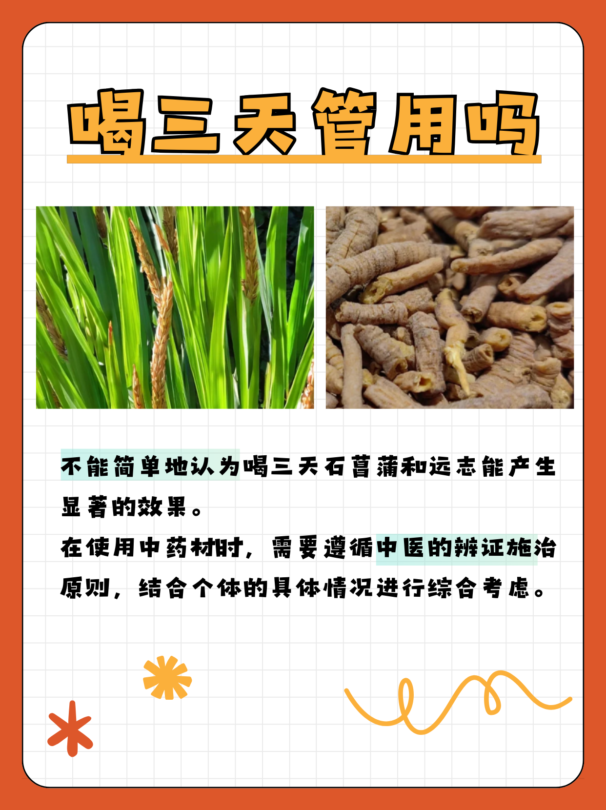 石菖蒲和远志泡水喝三天后是否管用,需要结合具体的病情和体质来考虑。❗中药材的药效发挥通常需要一定的时间,受到多种因素的影响,如病情的轻重、病程的长短、个体的体质差异等。✨中药材的用量和用法是影响药效的重要因素。如果病情较轻,病程较短,个体体质较好,💥可能在较短的时间内就能感受到药效。如果病情较重,病程较长,个体体质较差,可能需要更长的时间才能感受到药效。⏰在使用中药材时,需要遵循中医的辨证施治原则。如果在使用过程中出现不适症状或病情加重,应及时就医并咨询专业医生的意见。👩⚕️👨⚕️