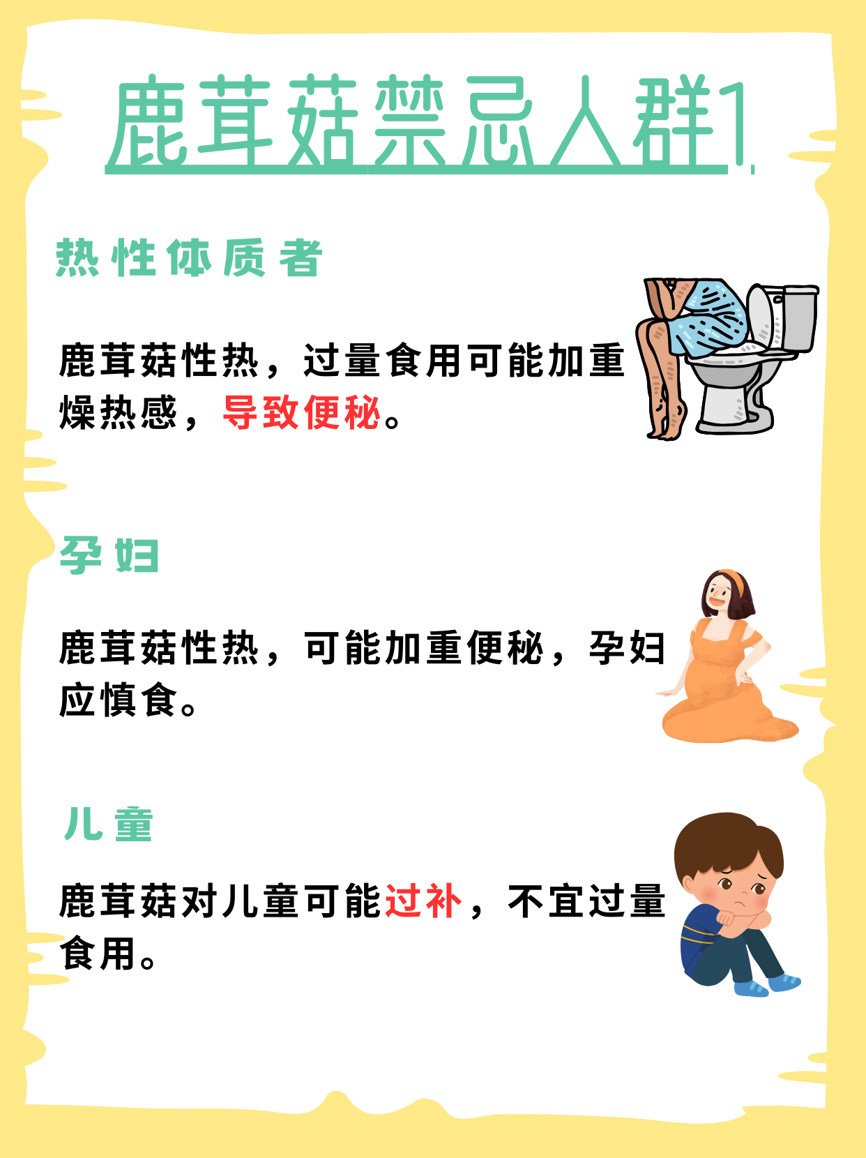 ➡️孕妇:鹿茸菇为热性食物,孕妇食用后可能会引起或加重便秘症状。