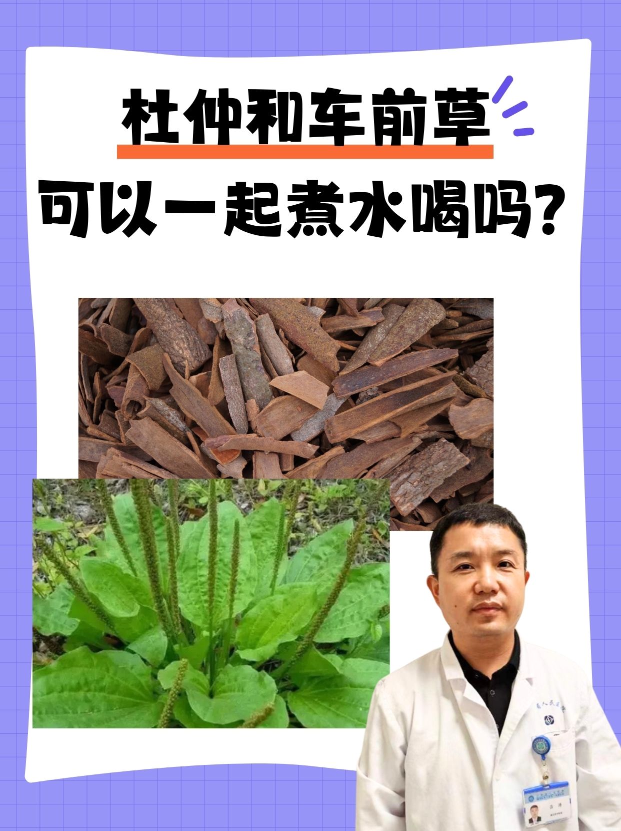 杜仲是一种具有温中、活血、补气血、化痰止咳、止血等多种功效的中药材,适用于✔️长期缺血、血虚、血压偏高、气虚乏力、久病体弱等症状的患者。而车前草的主要功效为清热,利尿,祛痰,凉血,解毒,主要用于✔️水肿尿少,热淋涩痛,暑湿泻痢,痰热咳嗽,吐血衄血,痈肿疮毒等症状。杜仲和车前草❗不建议一起煮水喝,因为这两种药材的药理特性和功效存在差异,且可能存在使用禁忌。以下是杜仲和车前草的主要功效注意👇: