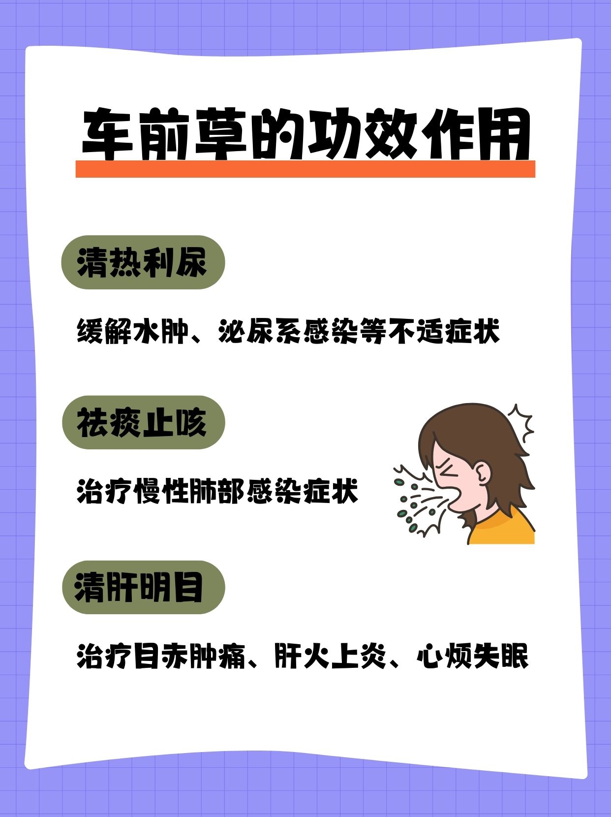车前草能够祛痰止咳,对咳嗽、咳痰、痰黄发热等慢性肺部感染症状有治疗作用。