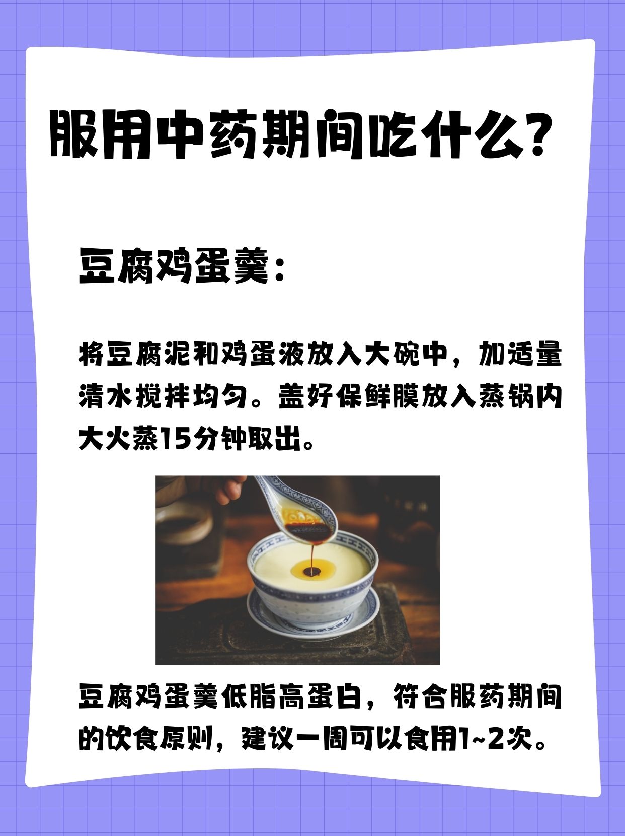 在服用中药期间应尽量保持饮食清淡,比如在药性不相克的情况下,我建议可以食用✅豆腐鸡蛋羹。