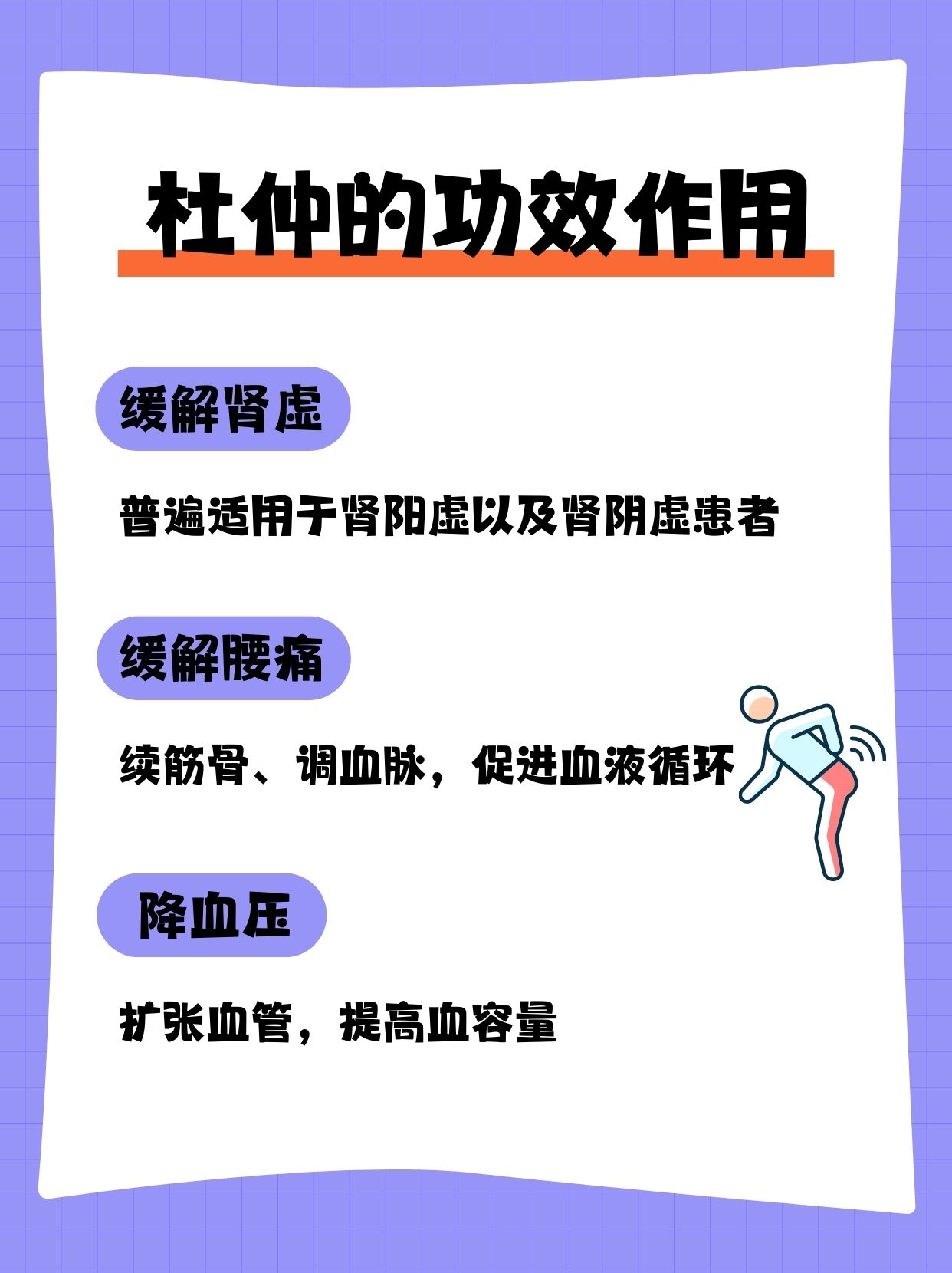杜仲通常能起到缓解肾虚导致的腰痛的作用,可以续筋骨、调血脉,促进腰部的血液循环。
