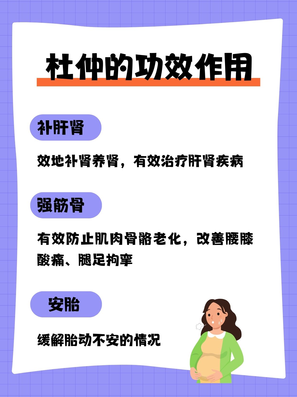杜仲味甘性温,归肝、肾经,具有补肝肾的功效。