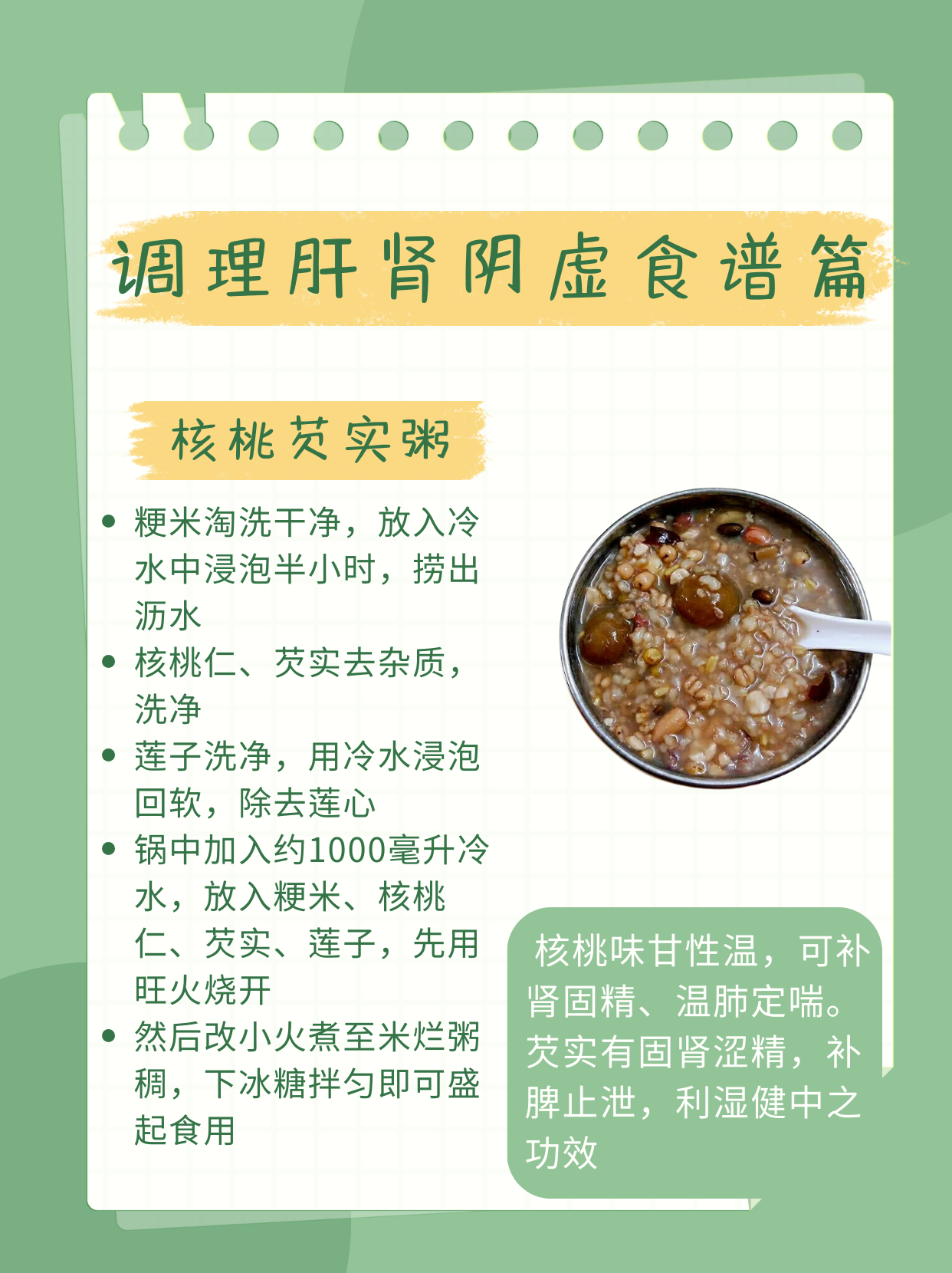 再给大家介绍一道调理肝肾阴虚的食物芡实核桃粥。核桃味甘性温,可补肾固精、温肺定喘。芡实有固肾涩精,补脾止泄,利湿健中之功效。