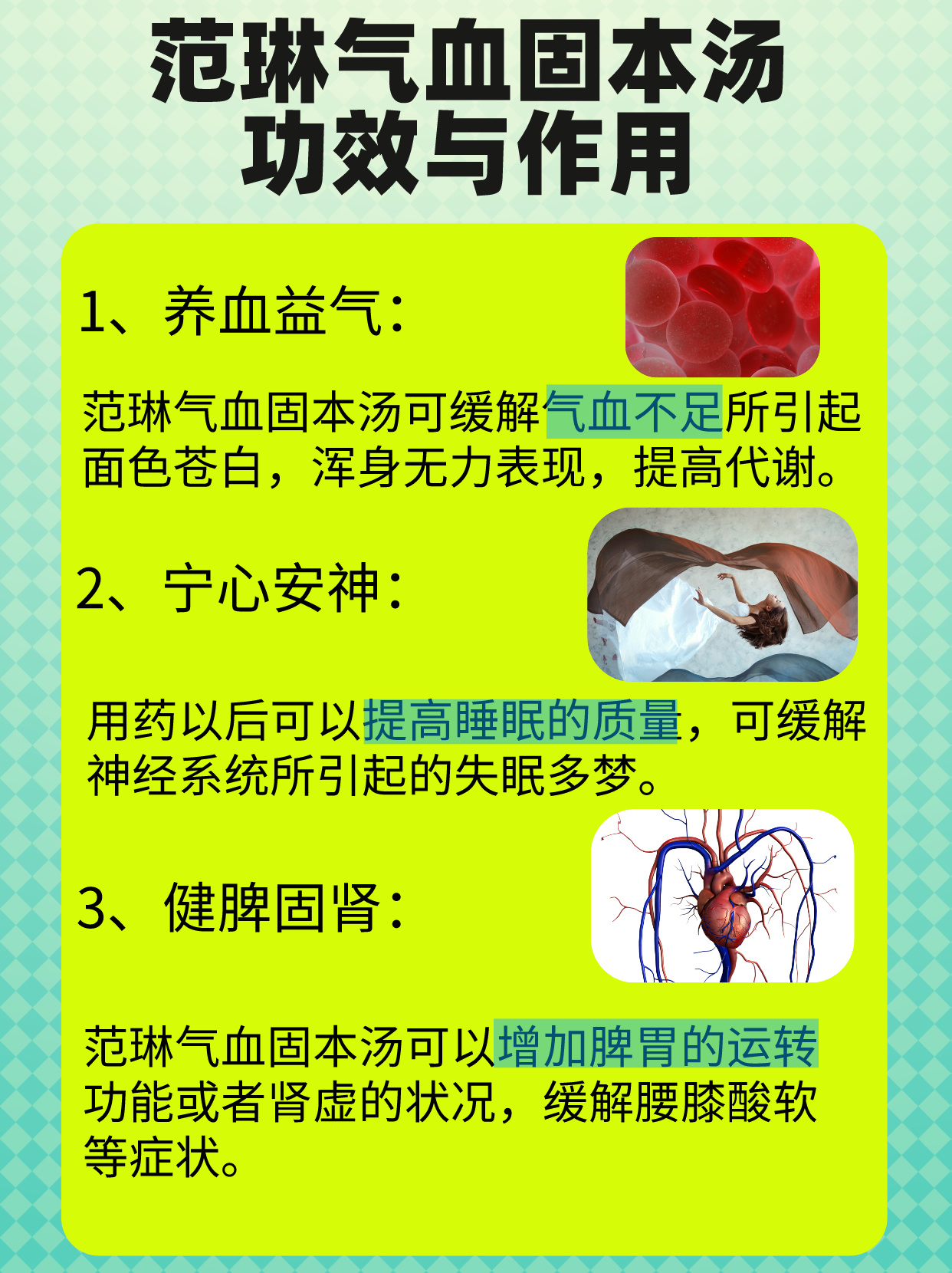 2、宁心安神:范琳气血固本汤还具有宁心安神的功效,对失眠、乏力等神经系统相关病症有较好的治疗作用,能够帮助患者改善睡眠质量,恢复精力。🏠