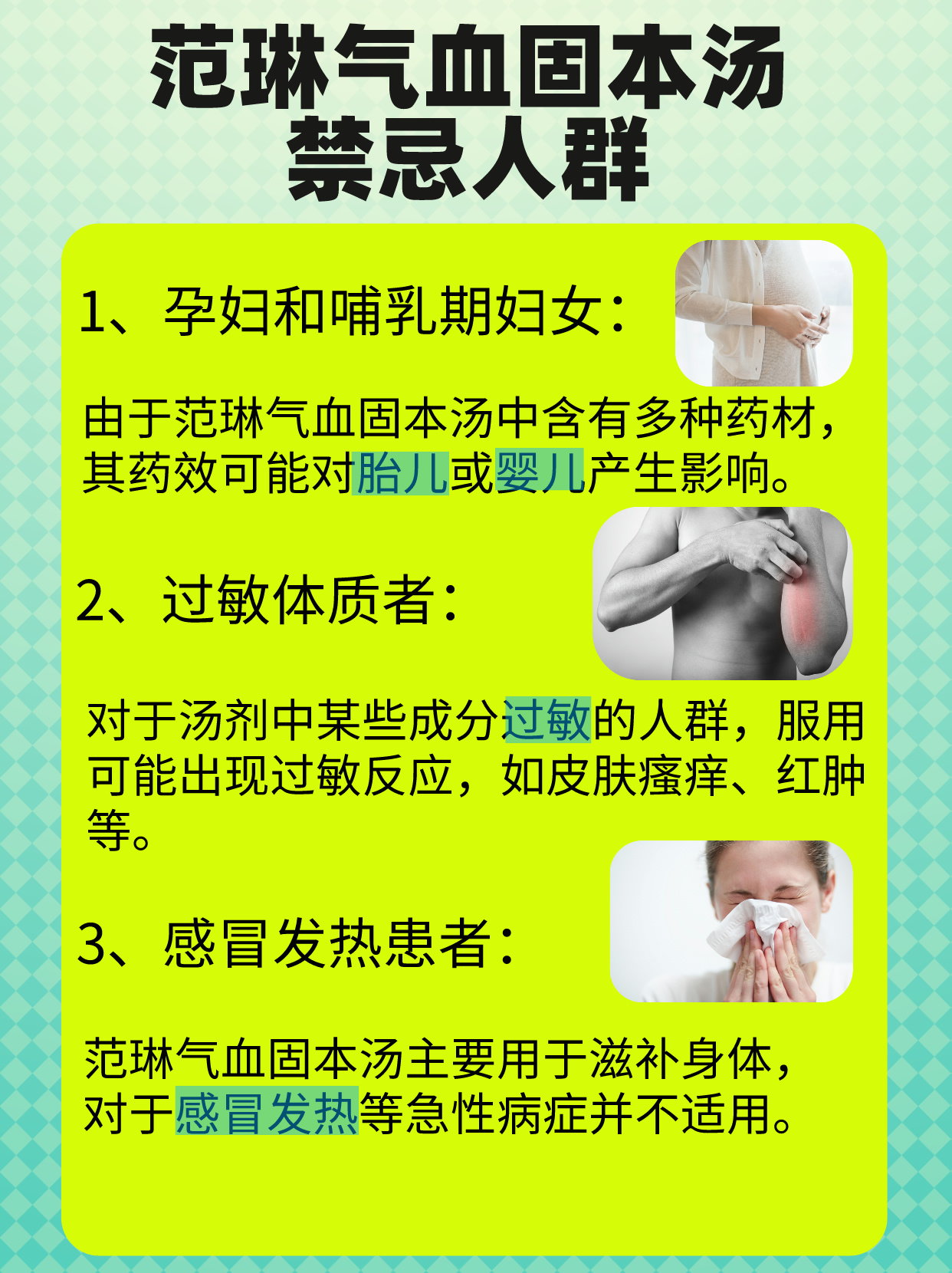 请尽管气血固本汤具有多种功效,但并非所有人都适用。每个人的体质和病情都有所不同,因此在服用前,最好先咨询专业医生或药师的意见,确保药物使用的安全和有效性。🆗