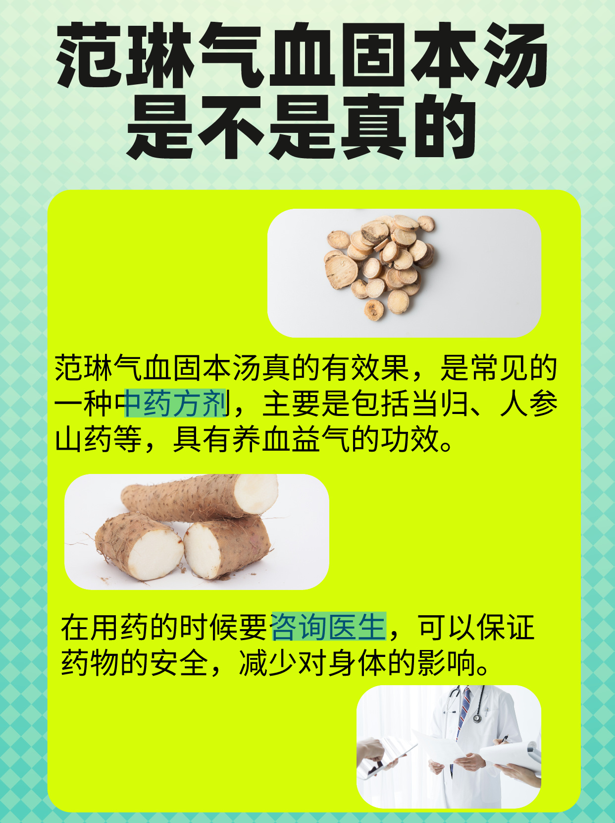 我告诉他,范琳气血固本汤是真的。是一种中药方剂,其主要成分通常包括当归、山药、人参、白术等,具有养血益气、宁心安神以及健脾固肾等功效。📕