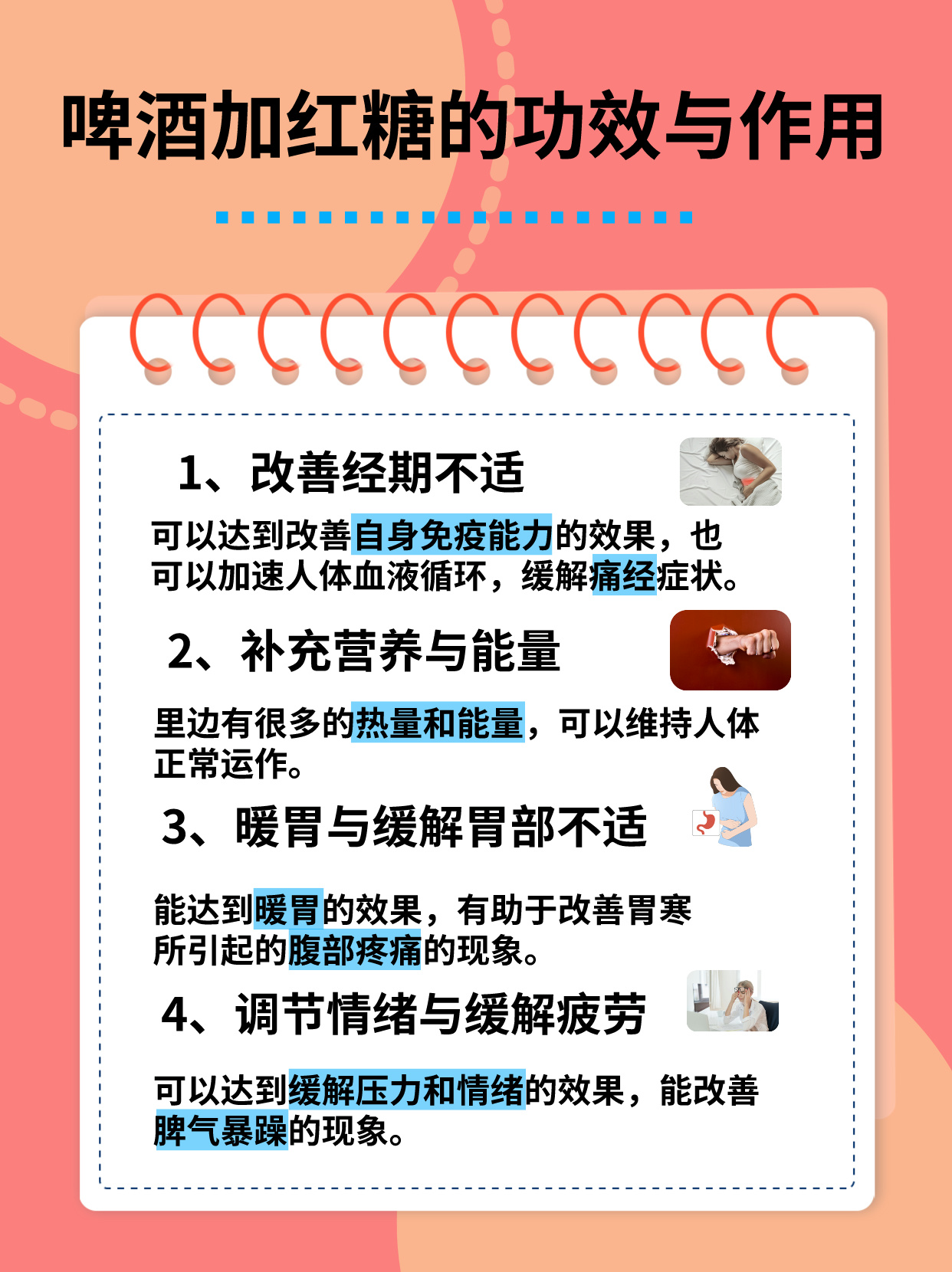 3、暖胃与缓解胃部不适:红糖具有性温的特点,啤酒加红糖可以一定程度上帮助女性暖胃,缓解胃部的不适症状。然而,这种作用通常较为有限,不能替代专业的药物治疗。♋