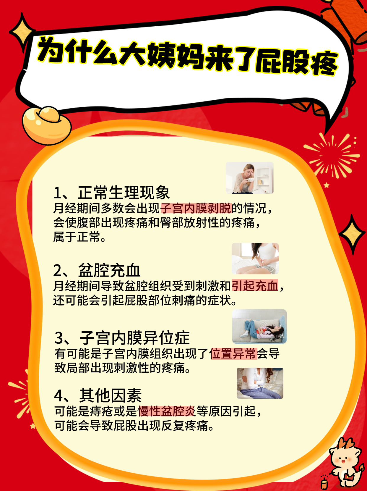 🆗3月3日,昨天我的大姨妈来了,这次身体出现了严重的腰酸背痛,还总是无力和出现了屁股眼中疼痛的症状,让我很是不解,不知道为什么屁股疼痛会这么严重,于是咨询了医生,想要知道为什么大姨妈来了屁股疼?医生听完以后给我做了体格检查,告知可能是以下原因:❓