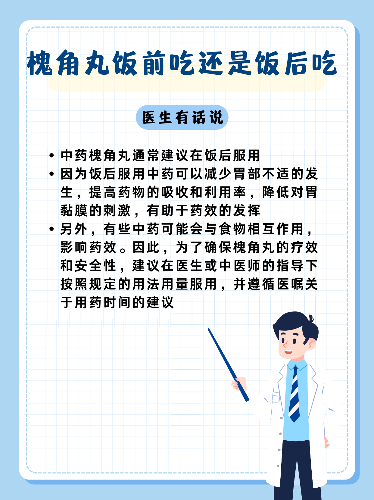 3月18号一位中年男士走进我的诊室,表情略显痛苦。他告诉我,自己最近患上了痔疮,非常痛苦,已经尝试过多种方法治疗,但效果都不尽如人意。我仔细询问了他的病情和用药史,发现他的痔疮症状比较严重,需要采用一些中药进行治疗。于是,我向他推荐了槐角丸这款中成药。那么槐角丸是饭前吃还是饭后吃呢?别急!专业医生来告诉你!