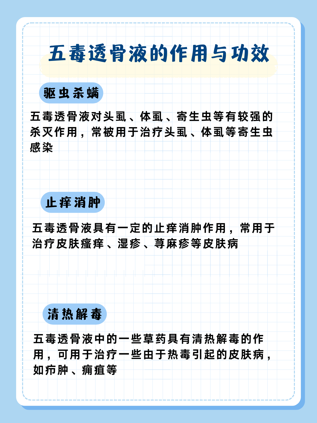 五毒透骨液,就像是肌肤的小卫士,对头虱、体虱、寄生虫等有着强大的杀灭作用。如果你正为这些烦人的小虫而苦恼,不妨试试它,让肌肤重获清爽与舒适。