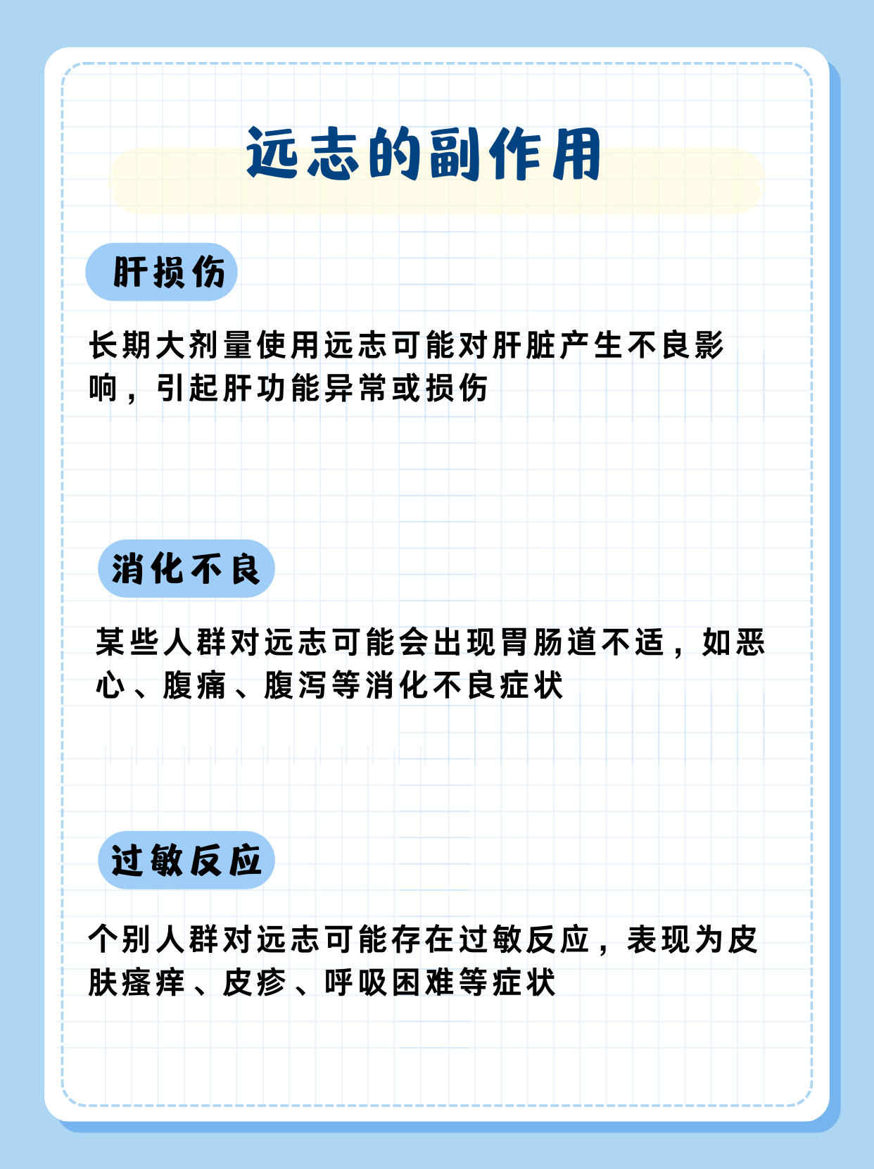 部分人群对远志中的某些成分可能存在过敏反应,如皮肤瘙痒、红肿、呼吸困难等。一旦出现过敏症状,应立即停止使用远志,并及时就医。