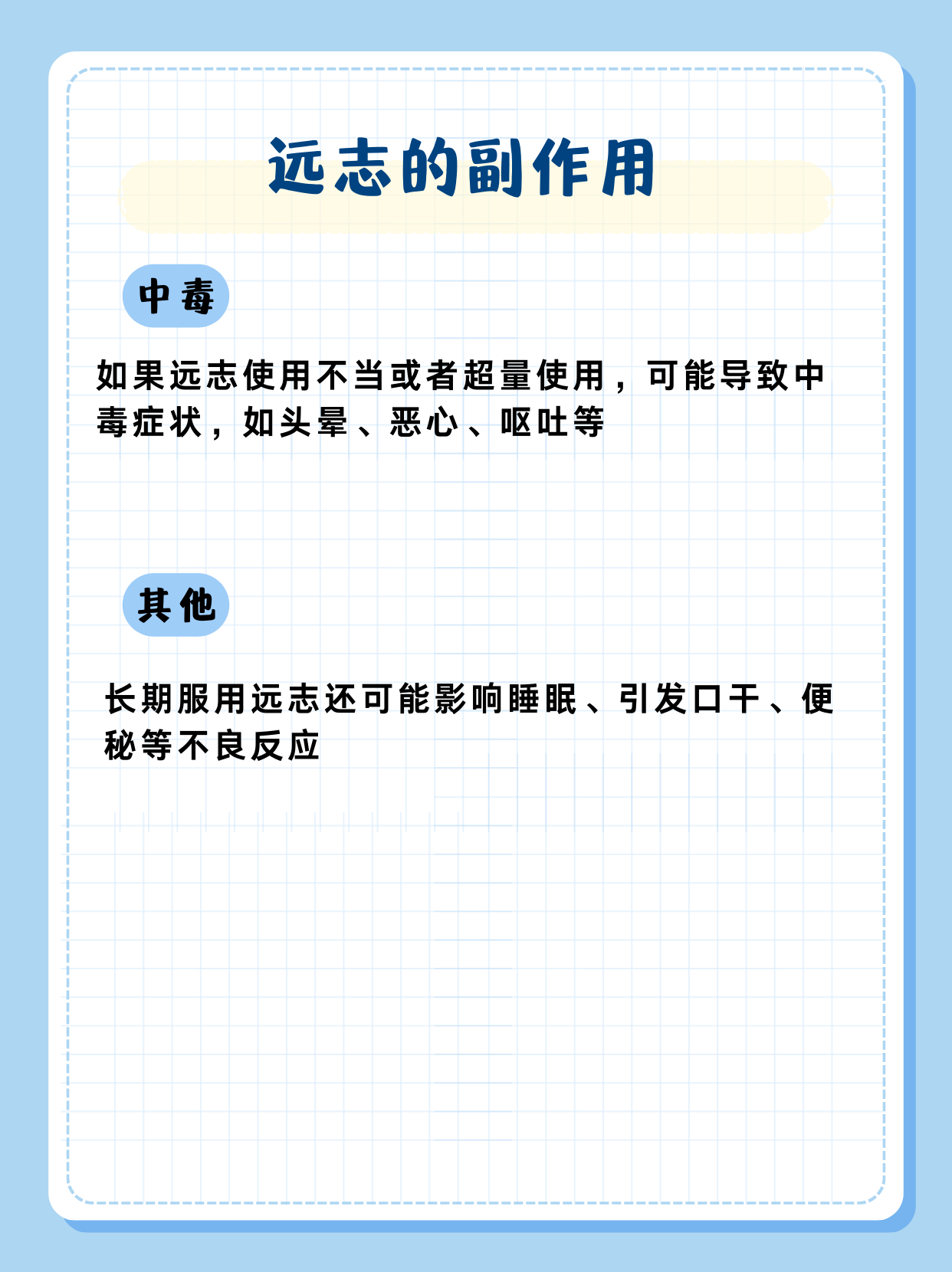 远志具有镇静安神的作用,但过量使用或长期使用可能会导致过度镇静,使人感到困倦、嗜睡。对于需要保持清醒状态的人群来说,如驾驶员、高空作业者等,这可能会带来一定的安全隐患。
