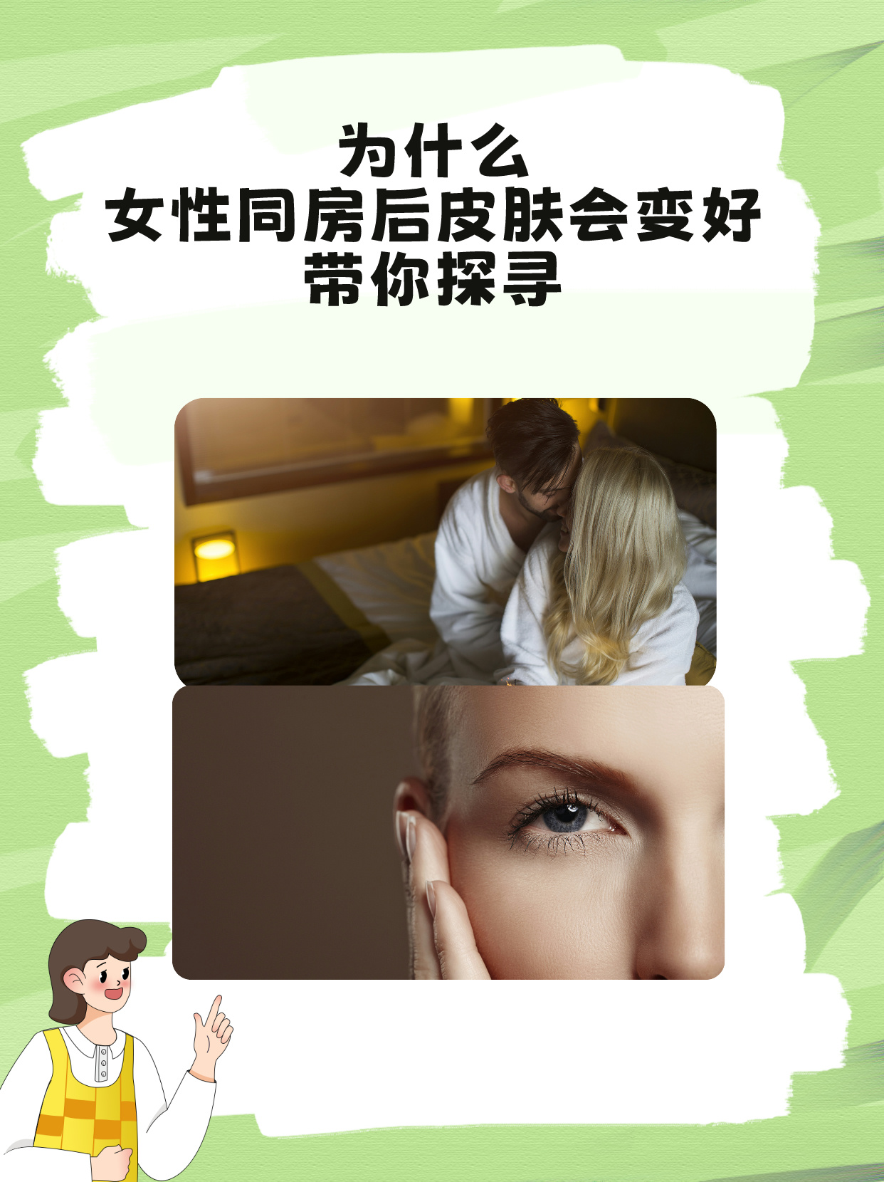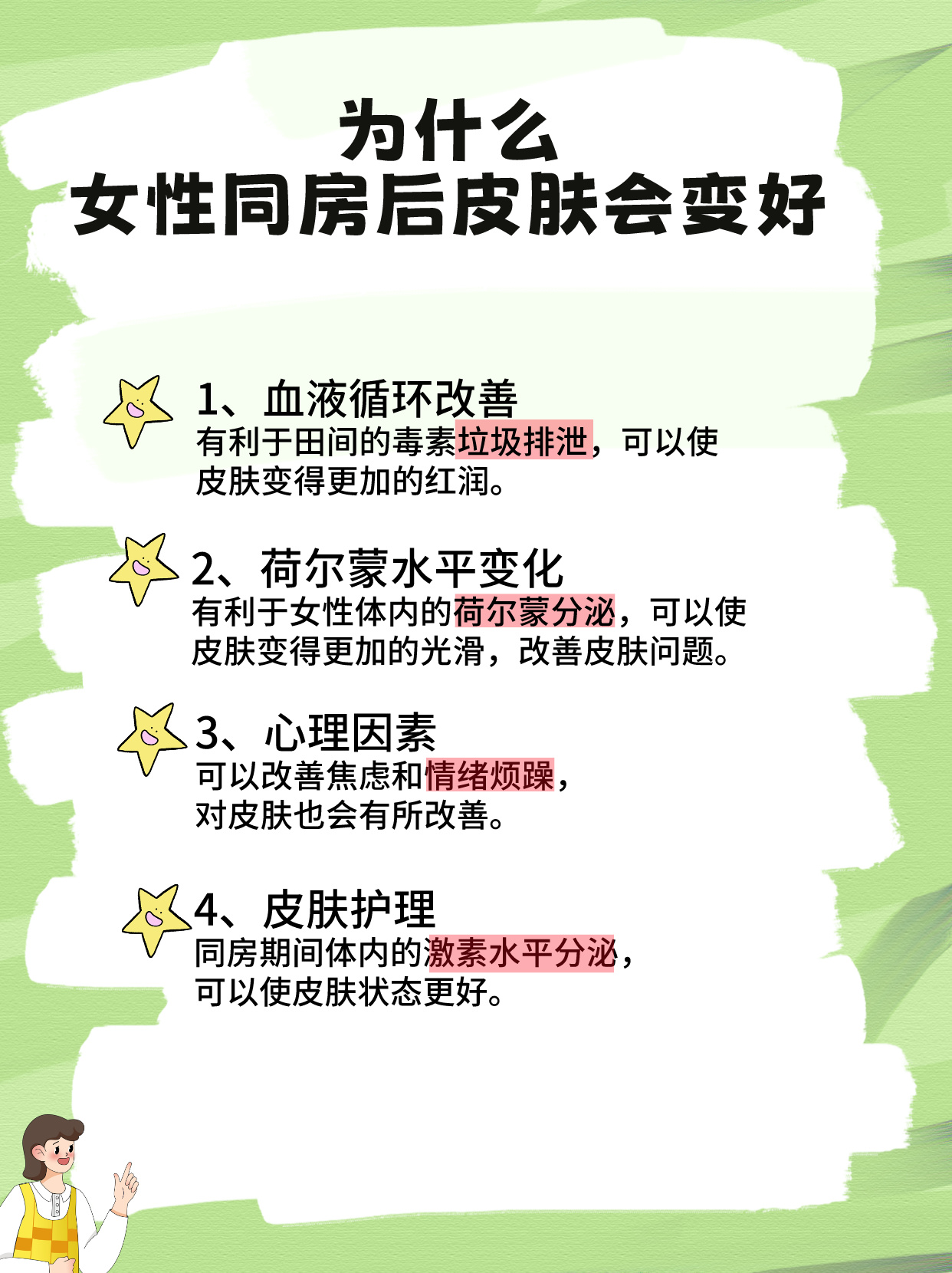 🏥3月10日,前段时间我的皮肤出现了严重的干燥症状,最近我的性生活恢复到正常状态,发现皮肤状态也变好了很多,看起来特别的水润和红润,到医院咨询了医生,想要知道为什么女性同房后皮肤会变好?医生听完以后告知,女性同房后皮肤变好的原因可能有以下四点:☎