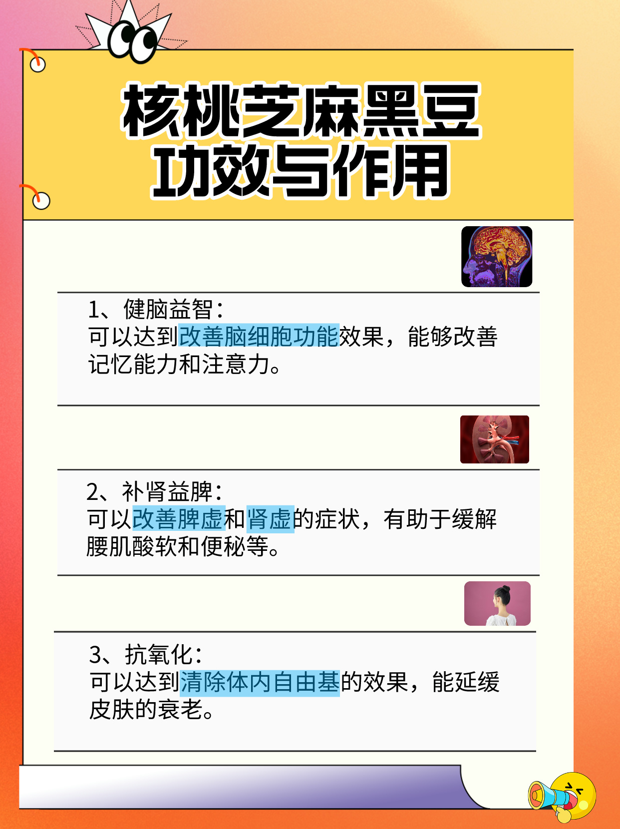 2、补肾益脾:黑豆和黑芝麻都具有补肾益脾的功效,可以改善肾虚和脾虚的症状,增强肾功能。核桃中的营养成分也对肾脏有益。此外,黑豆中的膳食纤维还可以促进肠道蠕动,改善便秘的症状,使肠道内的气体及毒素顺利排出体外。🍃