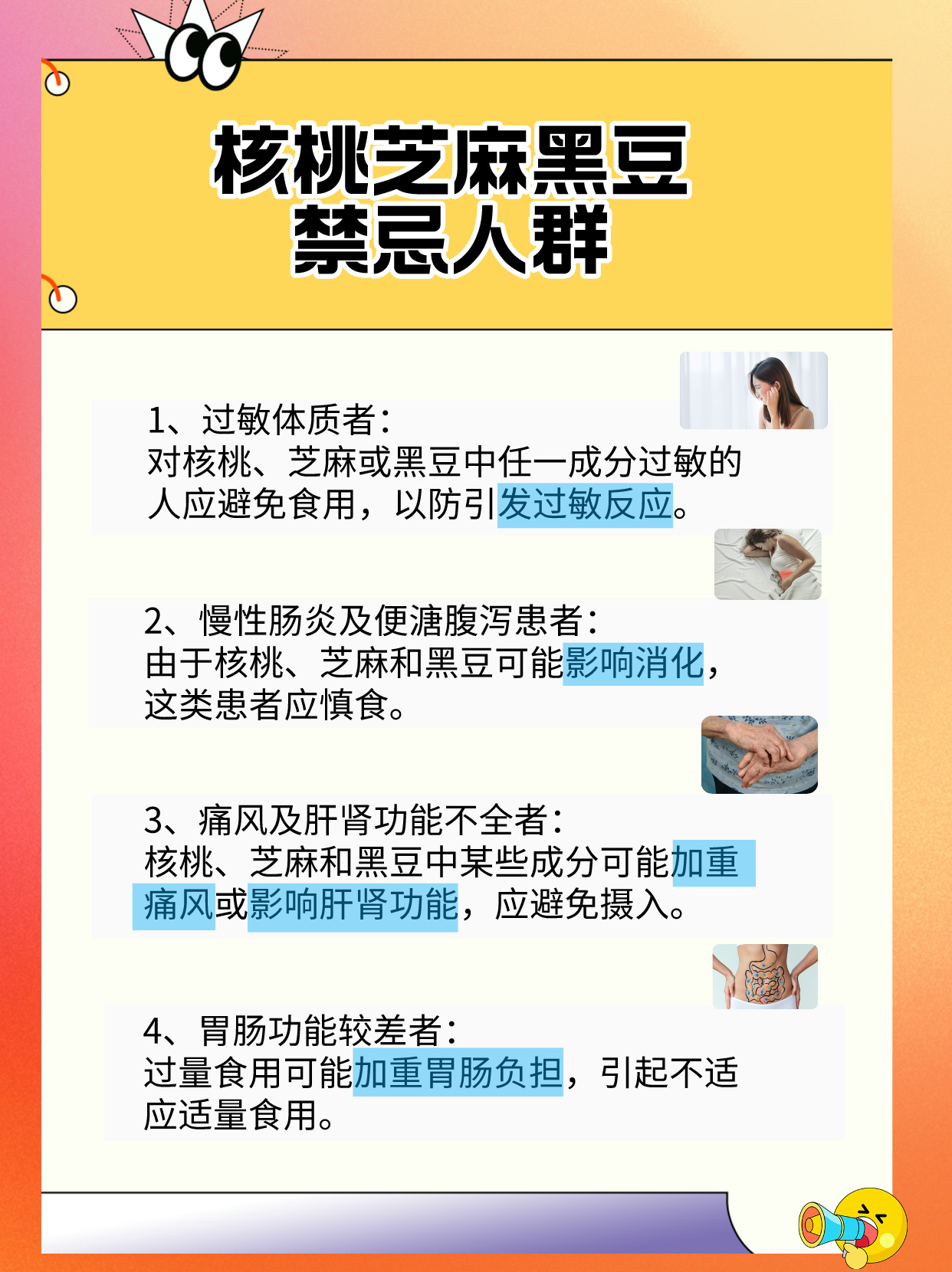 医生朋友还告诉我,并不是所有的人都可以吃这些食物,有一部分人群是不可以吃的,比如过敏体质者和慢性肠炎患者、痛风患者、胃肠功能较差的患者等,在吃了之后,有可能会对身体健康造成影响。📌